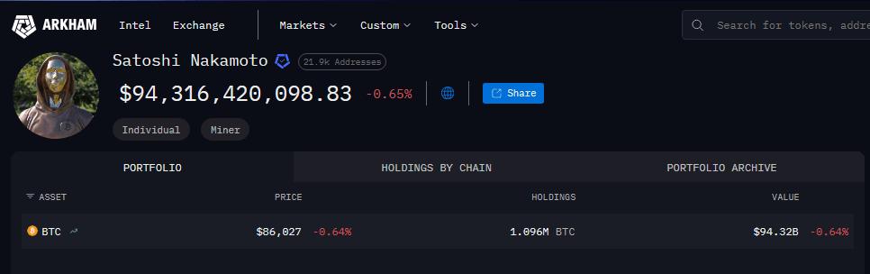比特币的暴跌使与其神秘创造者相关的估计财富大幅缩水。价格下跌从 10 月份接近 126,000 美元的峰值下跌超过 30%,跌至约 85,500 美元,这一暴跌使据信属于中本聪的硬币价值减少了约 410 亿美元。