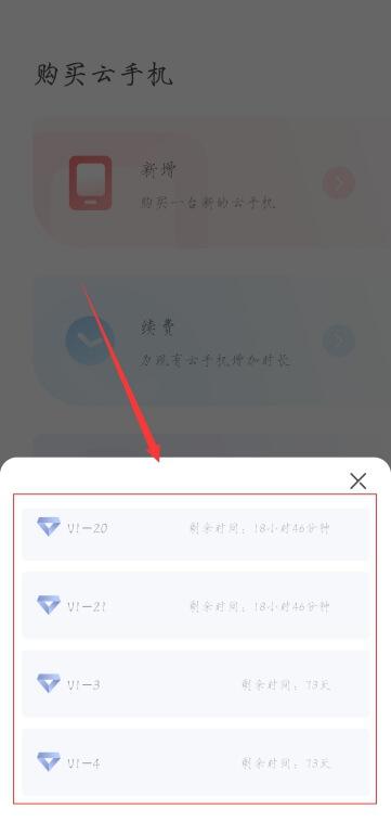 1. 用户可通过预览界面上方“升级续费”按钮直接升级当前云手机或者购买云手机选择升级云手机。