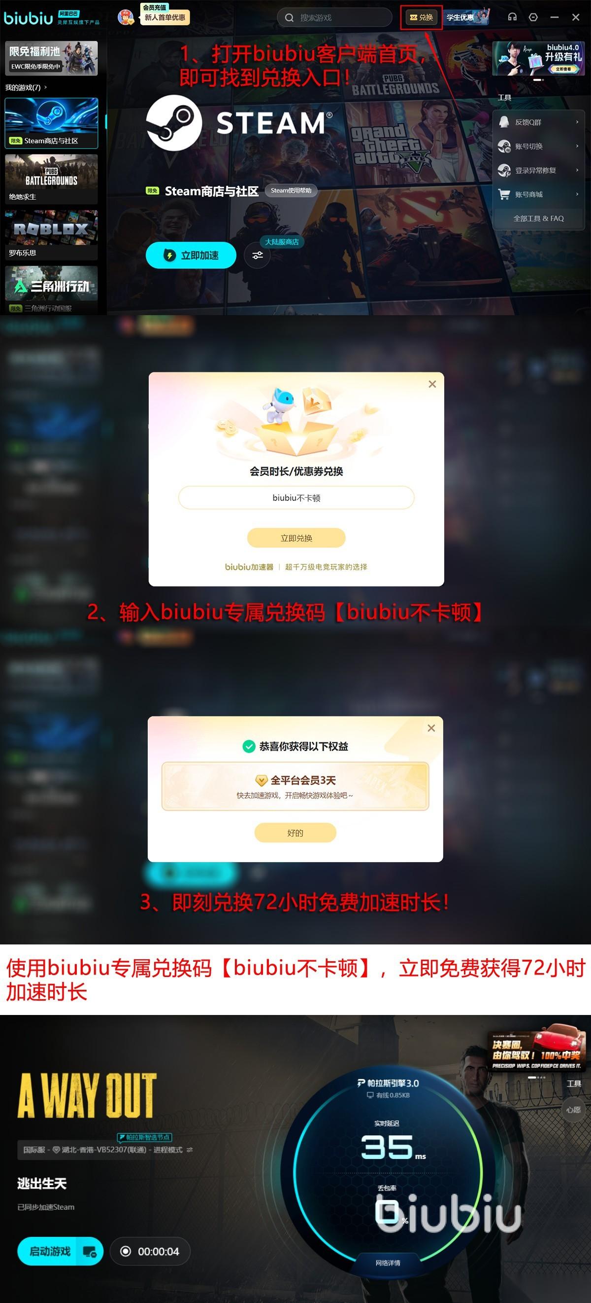 biubiu的使用也非常的贴心,安装后打开软件,首页的上方搜“逃出生天”,就能一键地启动,无需手动调设置,智能帮你优化运行,新手也能秒上手。它有遍布全球的节点可选,无论你身处何处,都有适配的可选,用起来性价比很高。福利的力度更是诚意满满,现在新人注册登录,就能领得24小时的免费时长。此外各位新老用户们,输入【biubiu不卡顿】的兑换码再续72小时,新人累计享长达96小时的体验时长,再也不用担心关键通关时刻掉链子,专注破解机关和看动画cg。