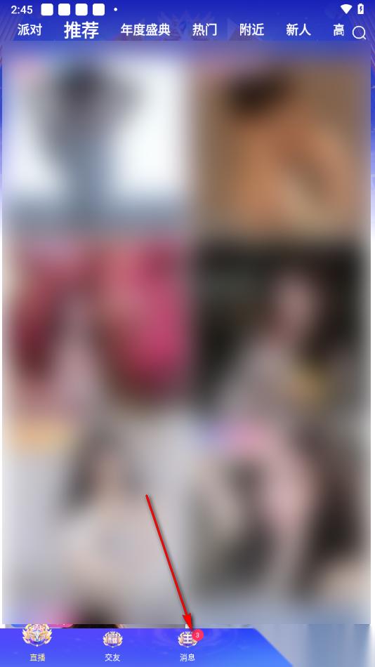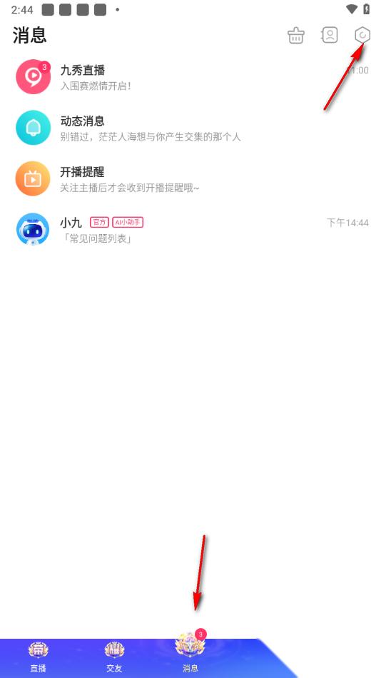 1.当我们进入到九秀直播app这款软件之后,直接将底部的【消息】选项点击打开。