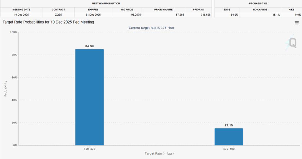 与此同时,比特币兑美元价格飙升的主要原因可能在于市场对美联储降息的预期。根据芝商所FedWatch工具的数据,美联储12月降息的概率飙升至85%,这或许提振了市场情绪。