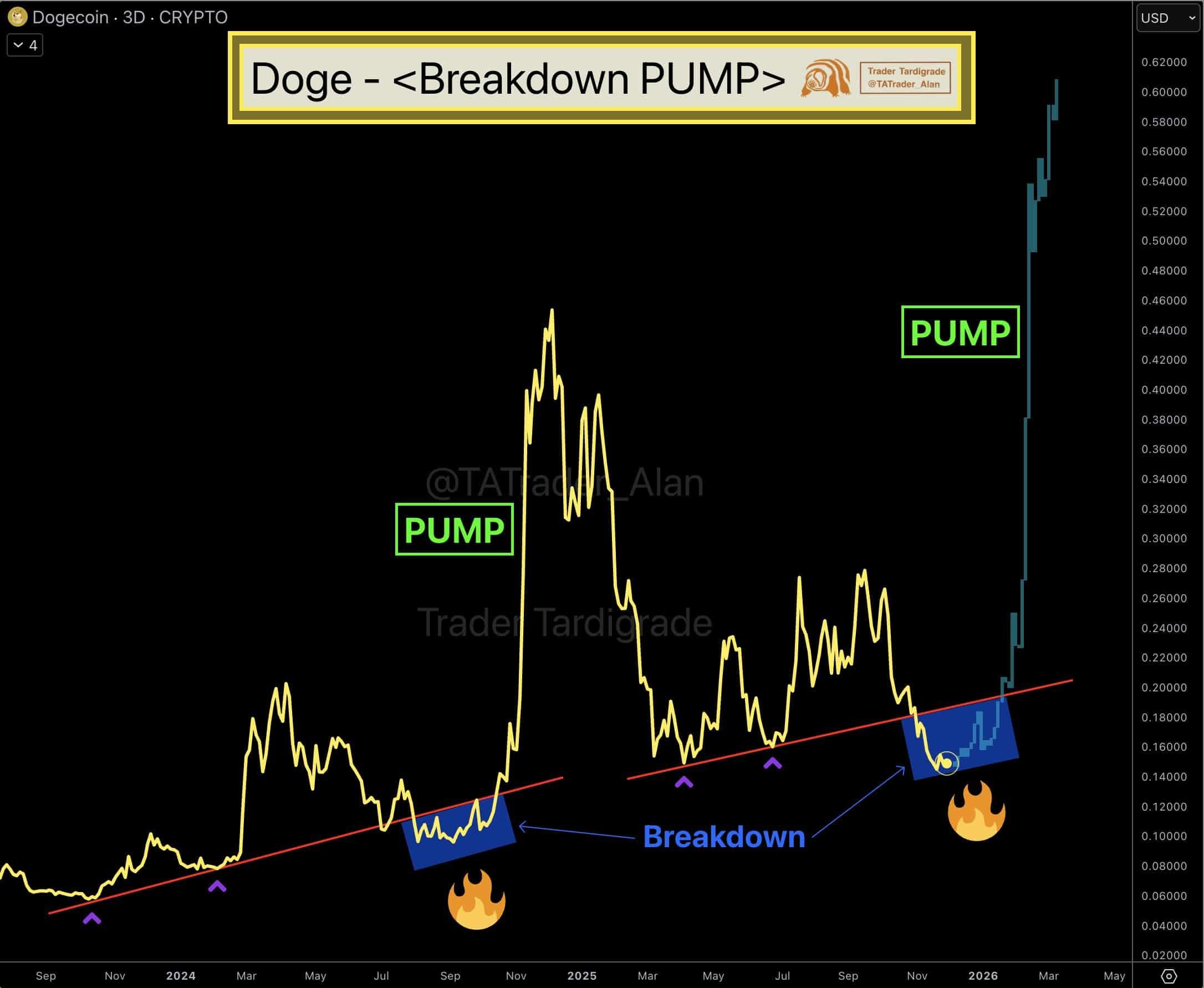 交易员 Tardigrade,X 的分析师,著名的狗狗币可能会出现上涨,甚至有可能突破 0.60 美元大关。