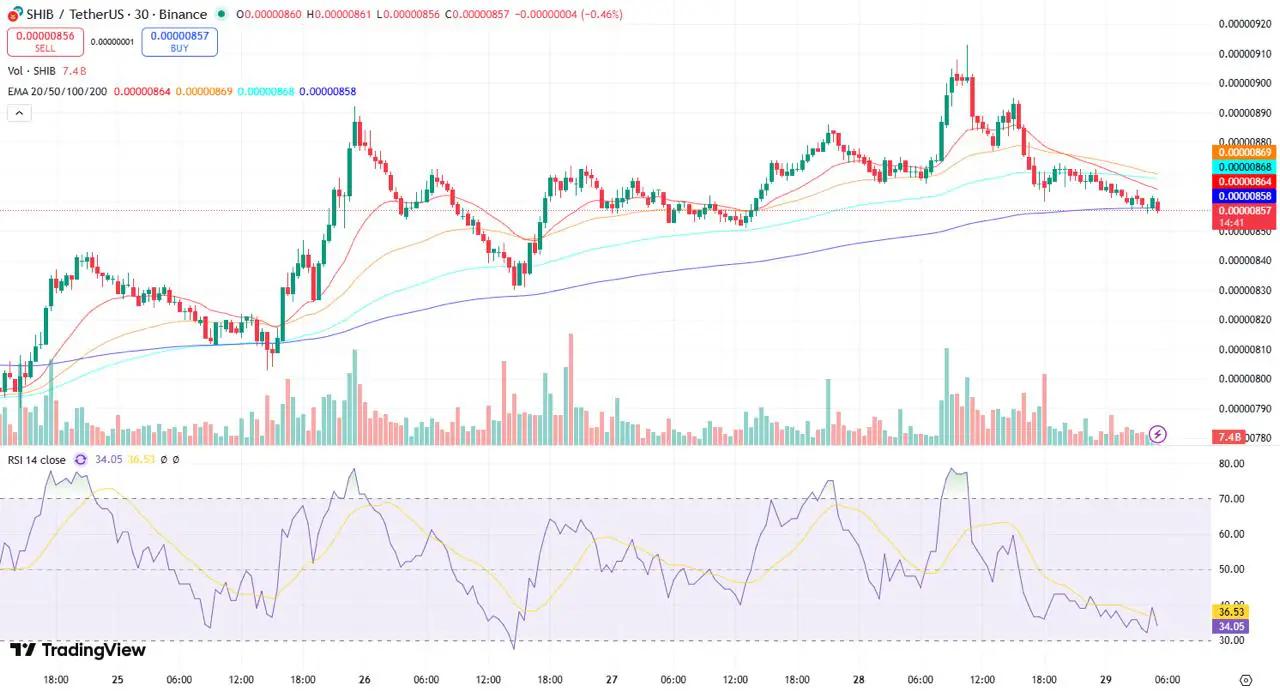 加密货币目前市场趋势正在评估SHIB在最近的支撑位附近会如何反应,因为市场情绪依然谨慎。