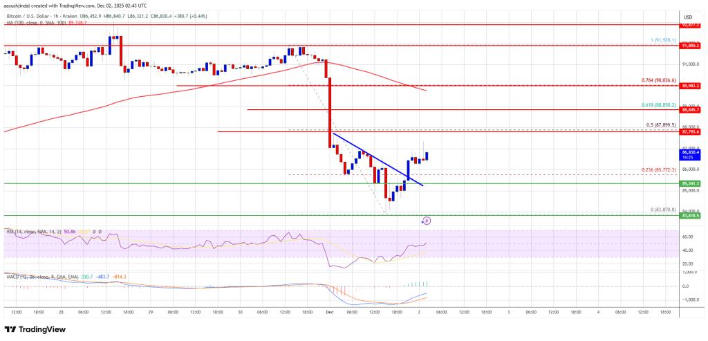 价格在 83,870 美元附近形成低点,目前正在修正跌幅。价格一度突破 85,000 美元关口。价格攀升至 91,928 美元高点至 83,870 美元低点下跌行情的 23.6% 斐波那契回撤位上方。