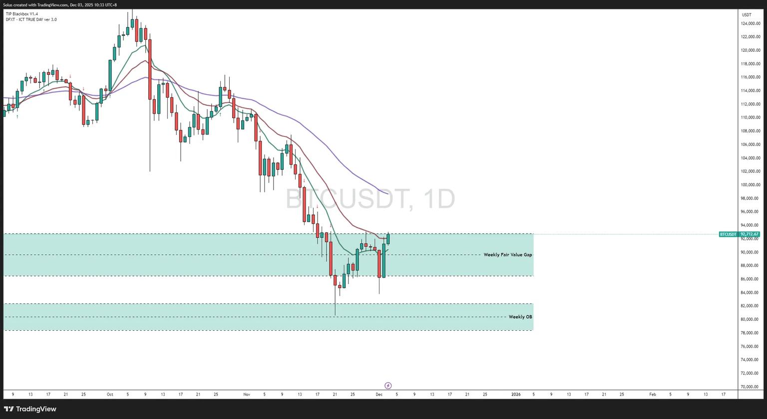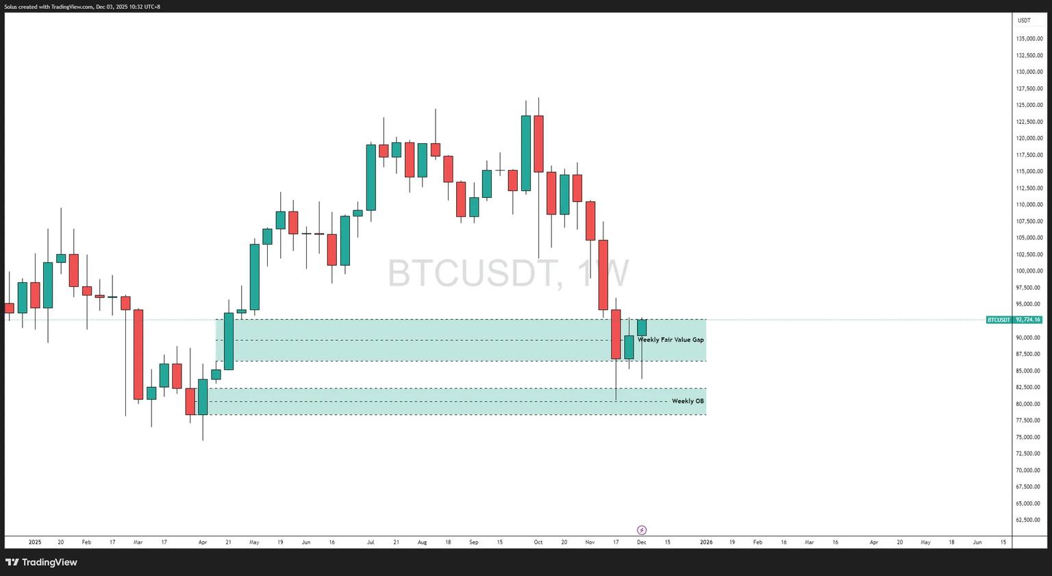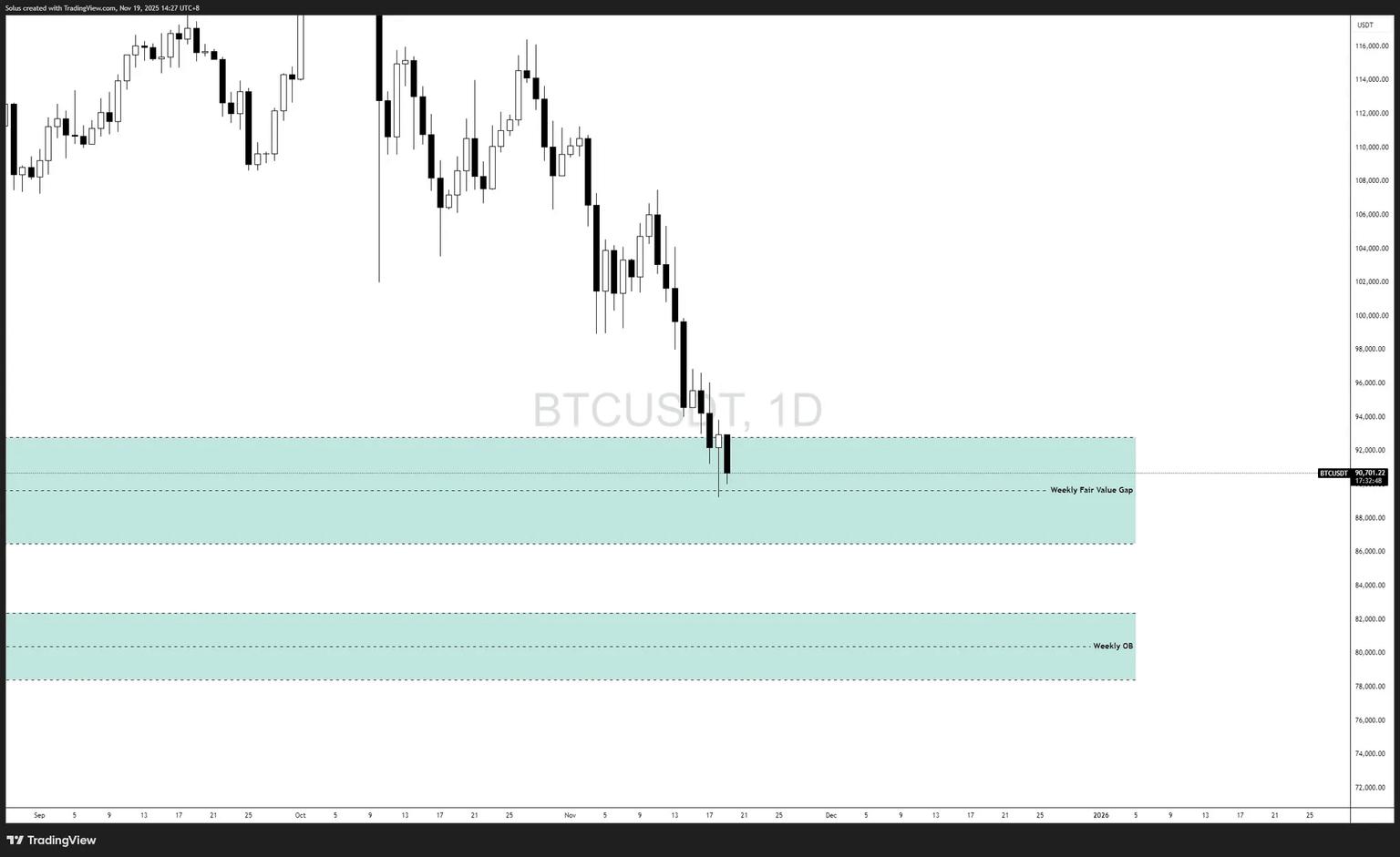 - 价格回落至周线 FVG 区域,卖方可能会再次尝试防守。