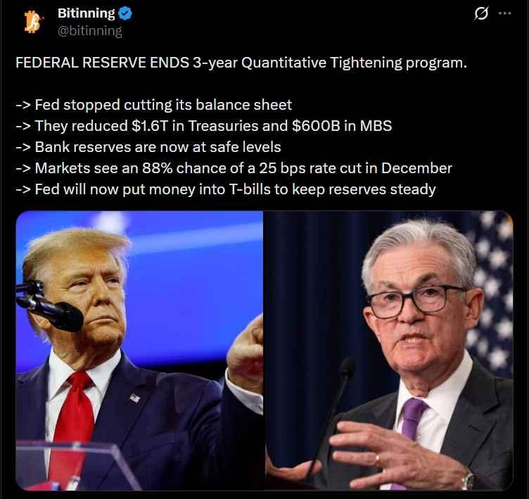 美联储决定结束为期三年的量化紧缩周期并转向流动性支持,被视为加密资产的利好催化剂。交易员预期美元融资状况改善、风险偏好上升以及12月可能降息——所有这些因素通常都会提振数字资产。
