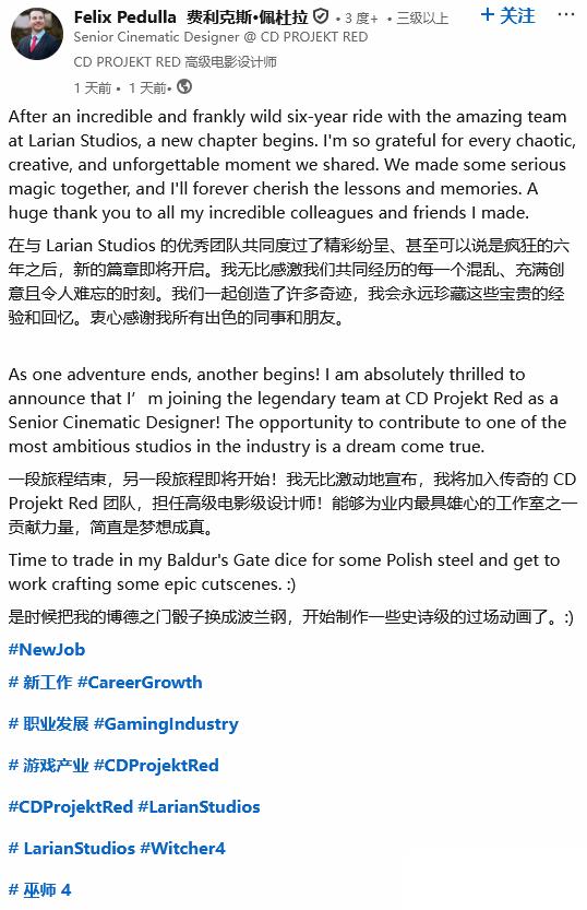 Felix Pedulla在领英上表示,他在拉瑞安工作六年后已加入CD Projekt RED,担任高级过场动画设计师(Senior Cinematic Designer)。Felix Pedulla还形容CDPR“是业内最具雄心的工作室之一”,某种程度上也显示了CDPR对旗下正在开发的项目的重视程度。