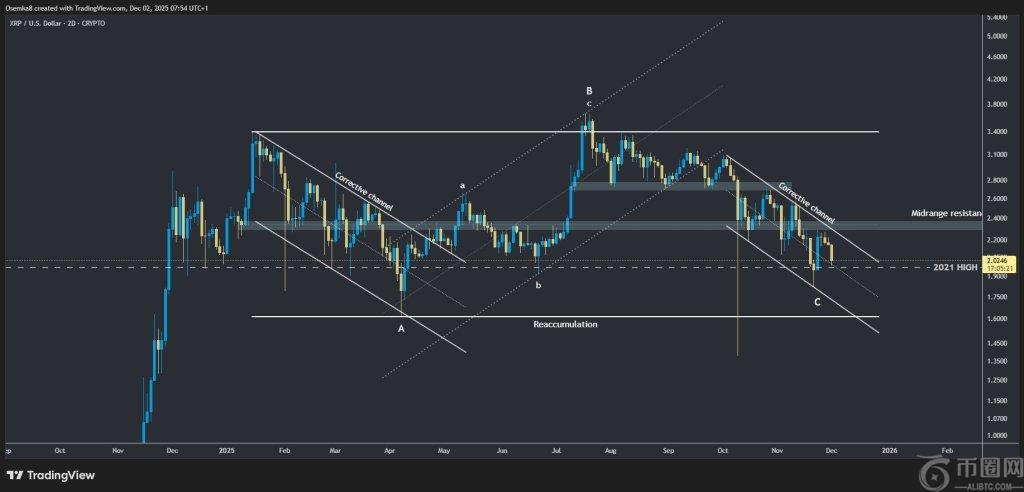 他的图表显示,XRP 价格在一个水平带内波动,该水平带的底部与 2021 年的高点重合,被标记为“重新积累”区域。价格多次触及该支撑位并反弹,而 2 美元中低位的阻力位则阻止了多次上涨。上方,一条更高的水平线标志着 1 月份的峰值,Osemka 将其视为周期顶部。
