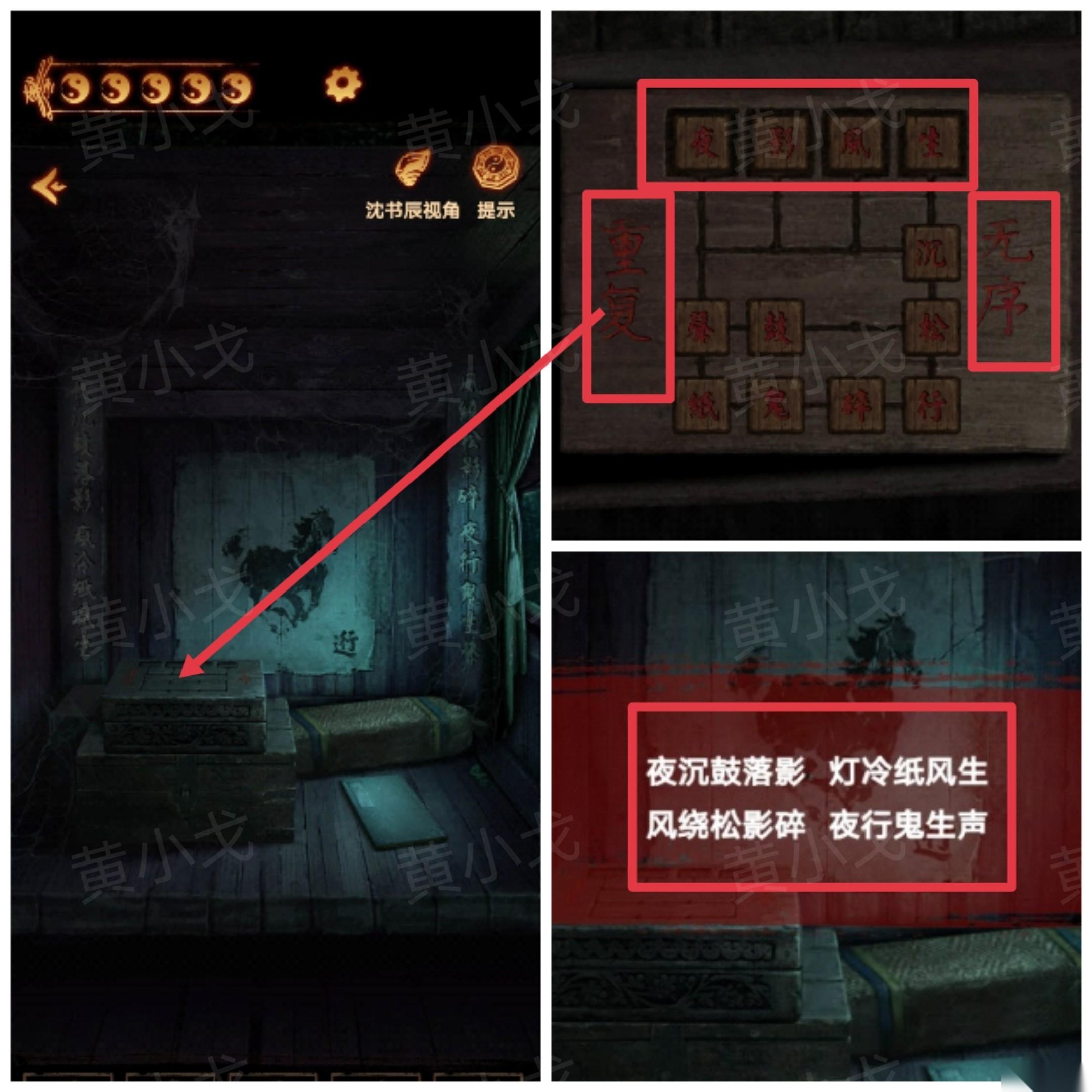 33、点击箱子上的密码锁,根据[柳佳宁]视角墙上被光线映亮的文字线索,输入密码:逢中玉代