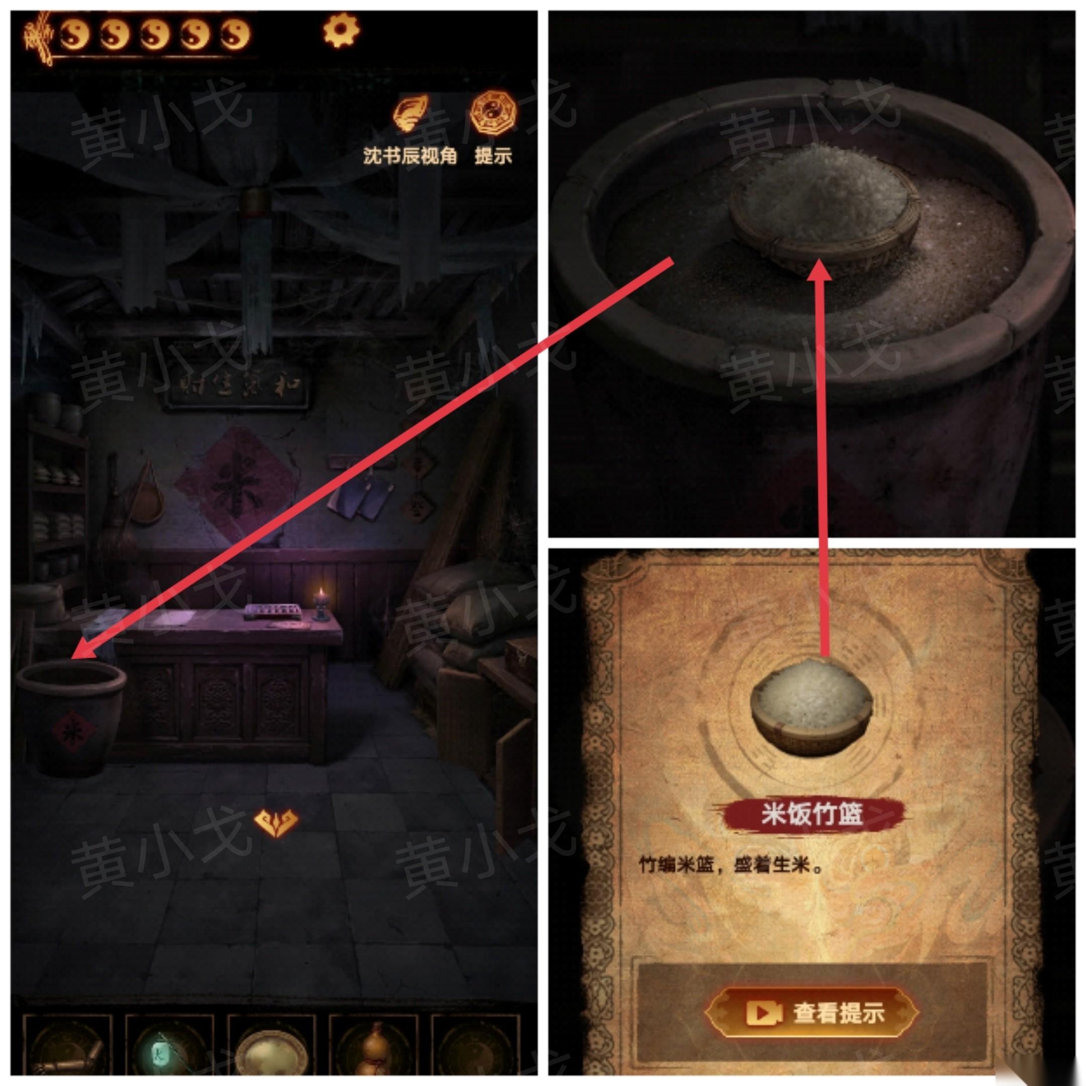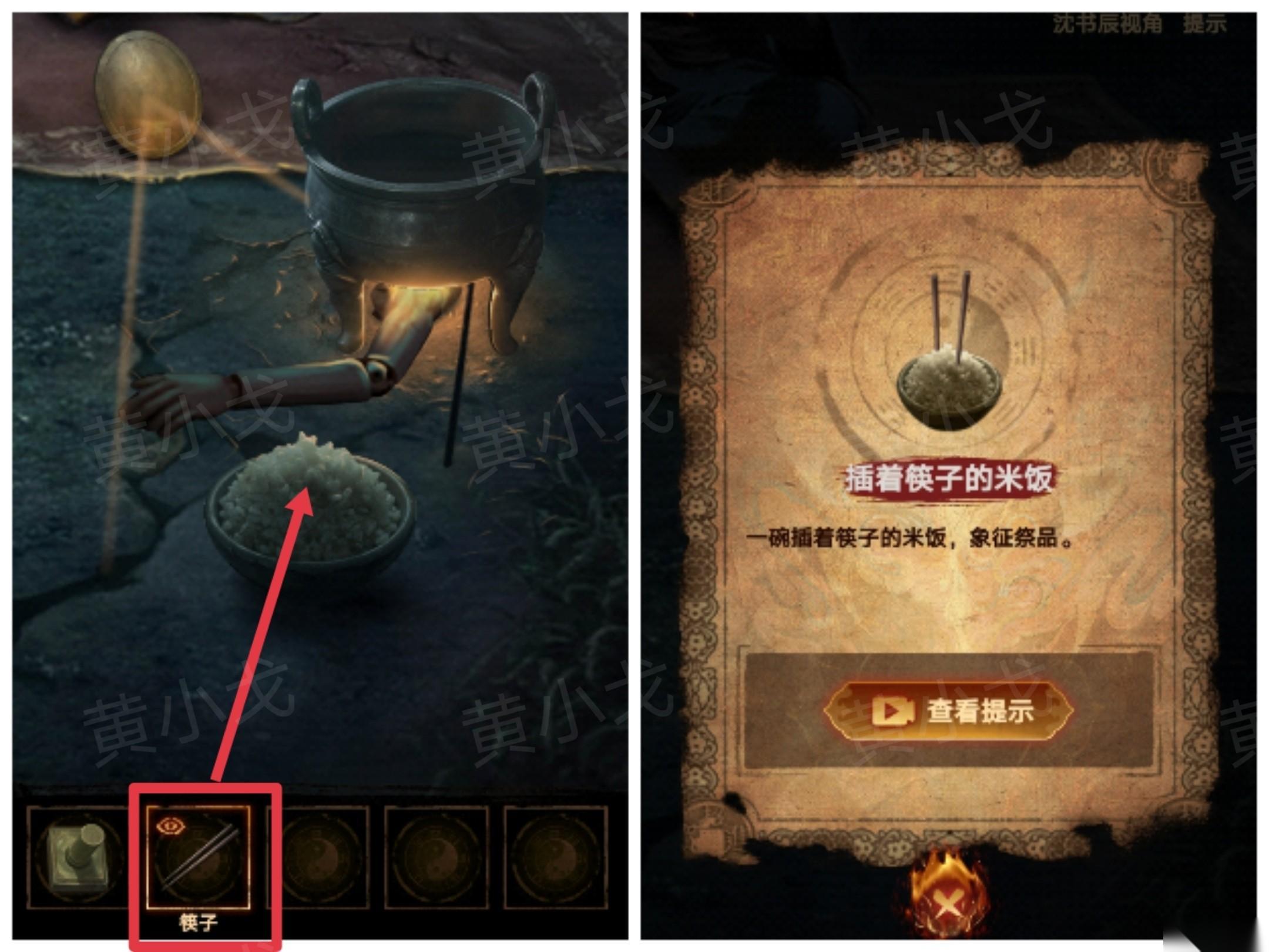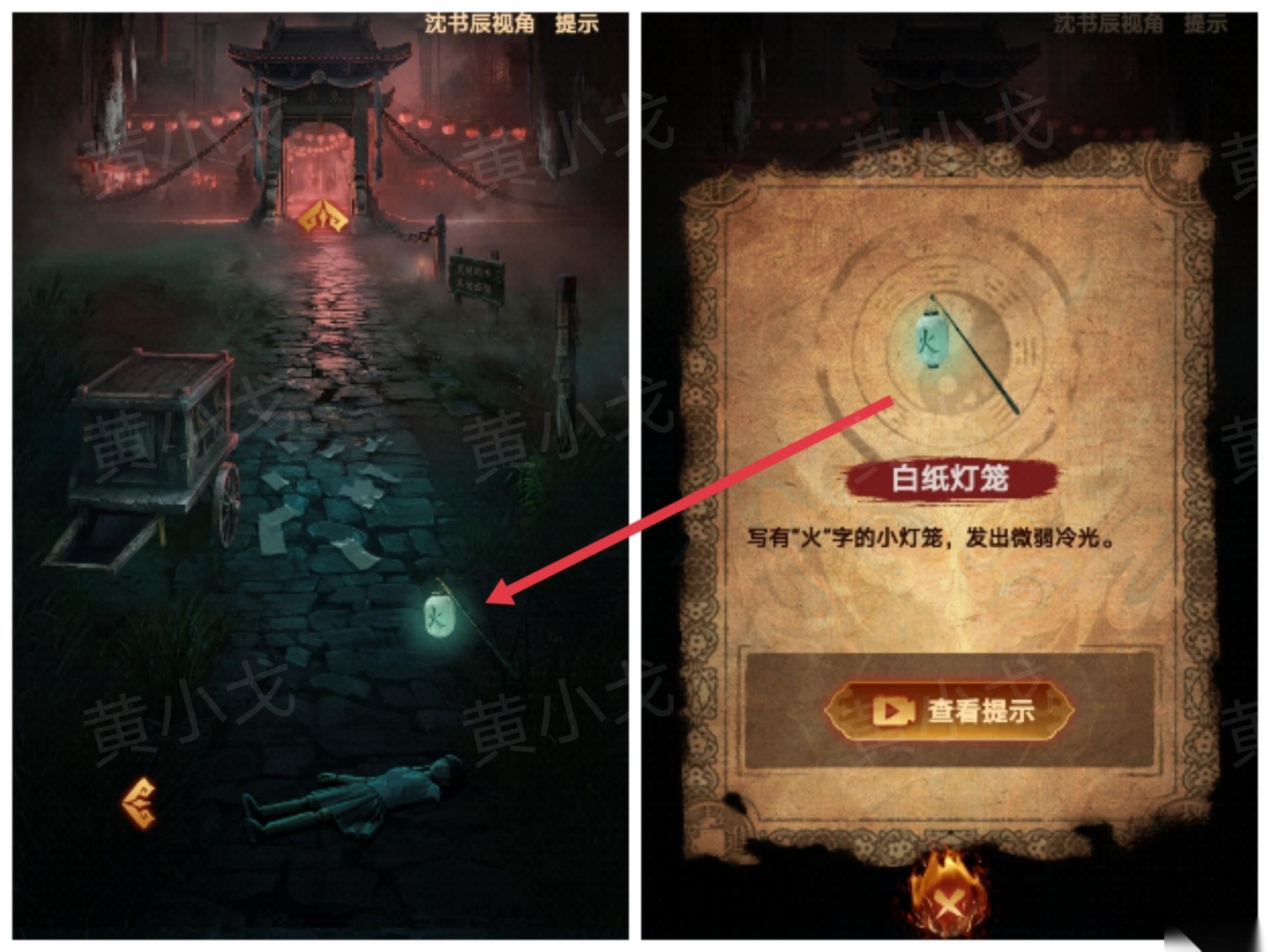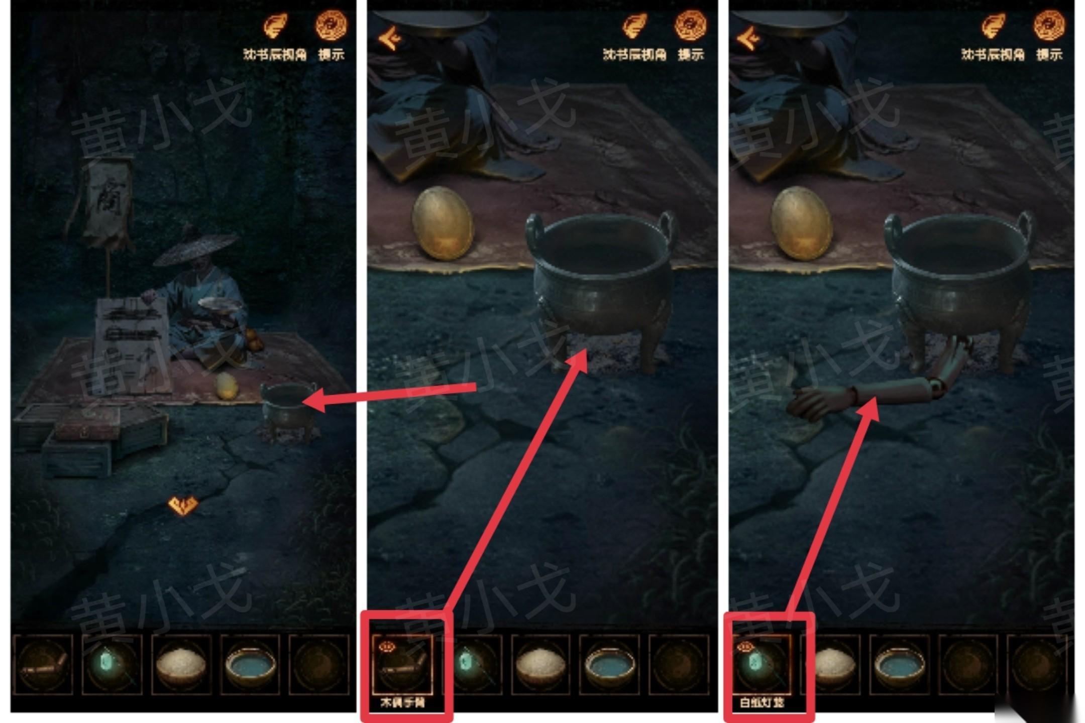 22、点击圆鼎,根据[鬼市西街-米铺]纸上的线索,把【木偶手臂】放到圆鼎下方,用【白纸灯笼】生火