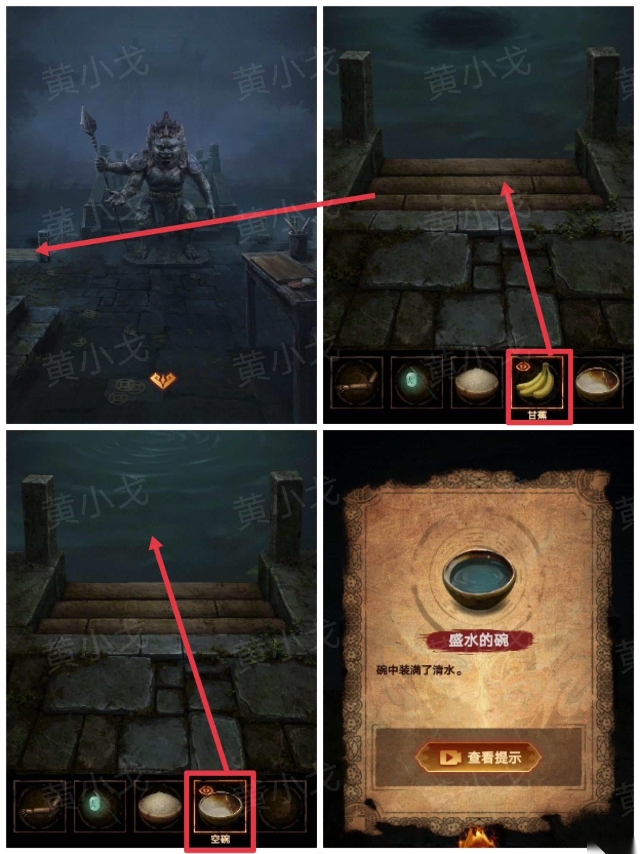 21、点击河边,拿【甘蕉】喂水猴子,水猴子消失;用【空碗】装水,获得【盛水的碗】