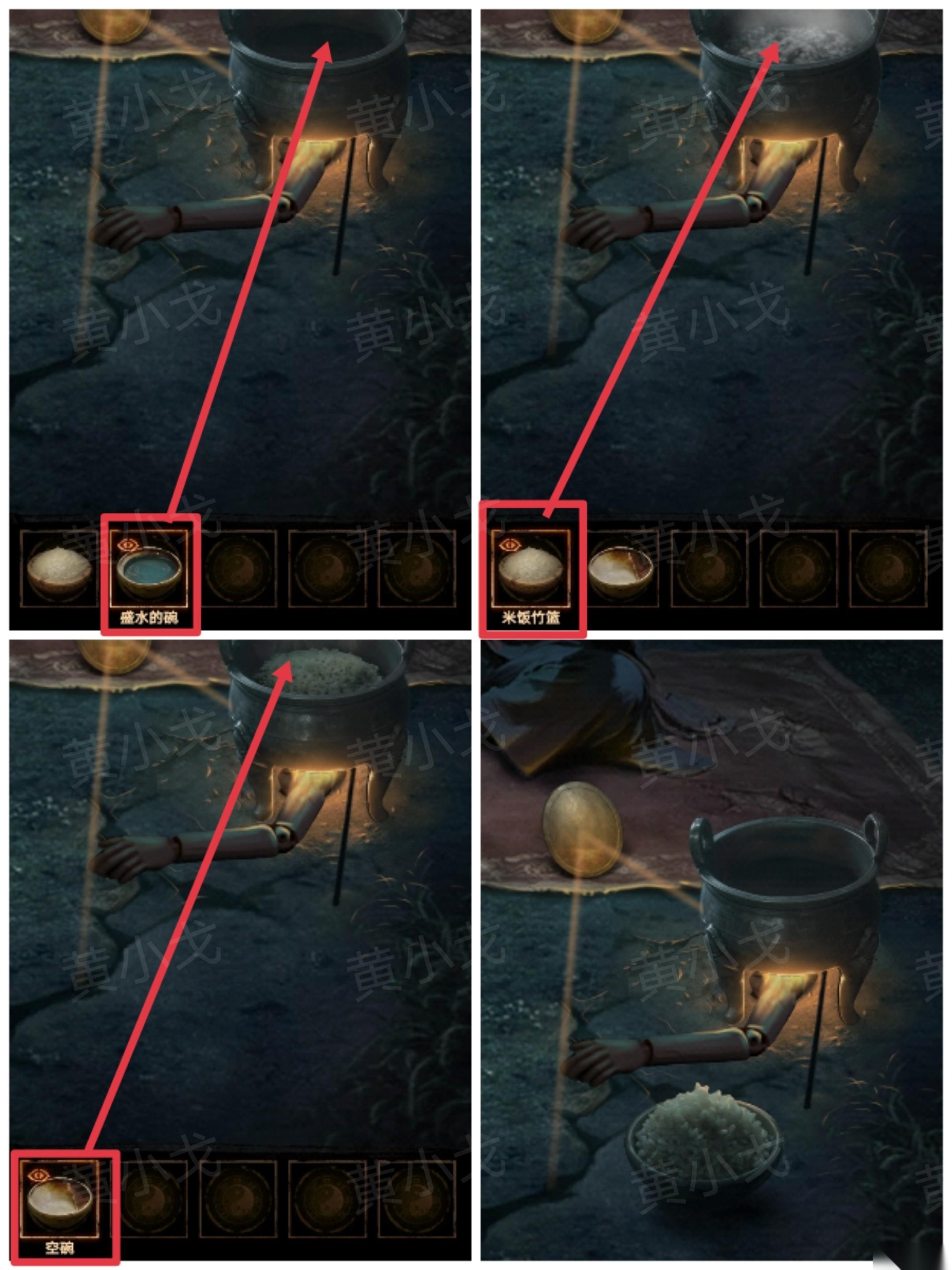 23、把【盛水的碗】倒入鼎中,放入【米饭竹篮】,煮好饭,用【空碗】装出来