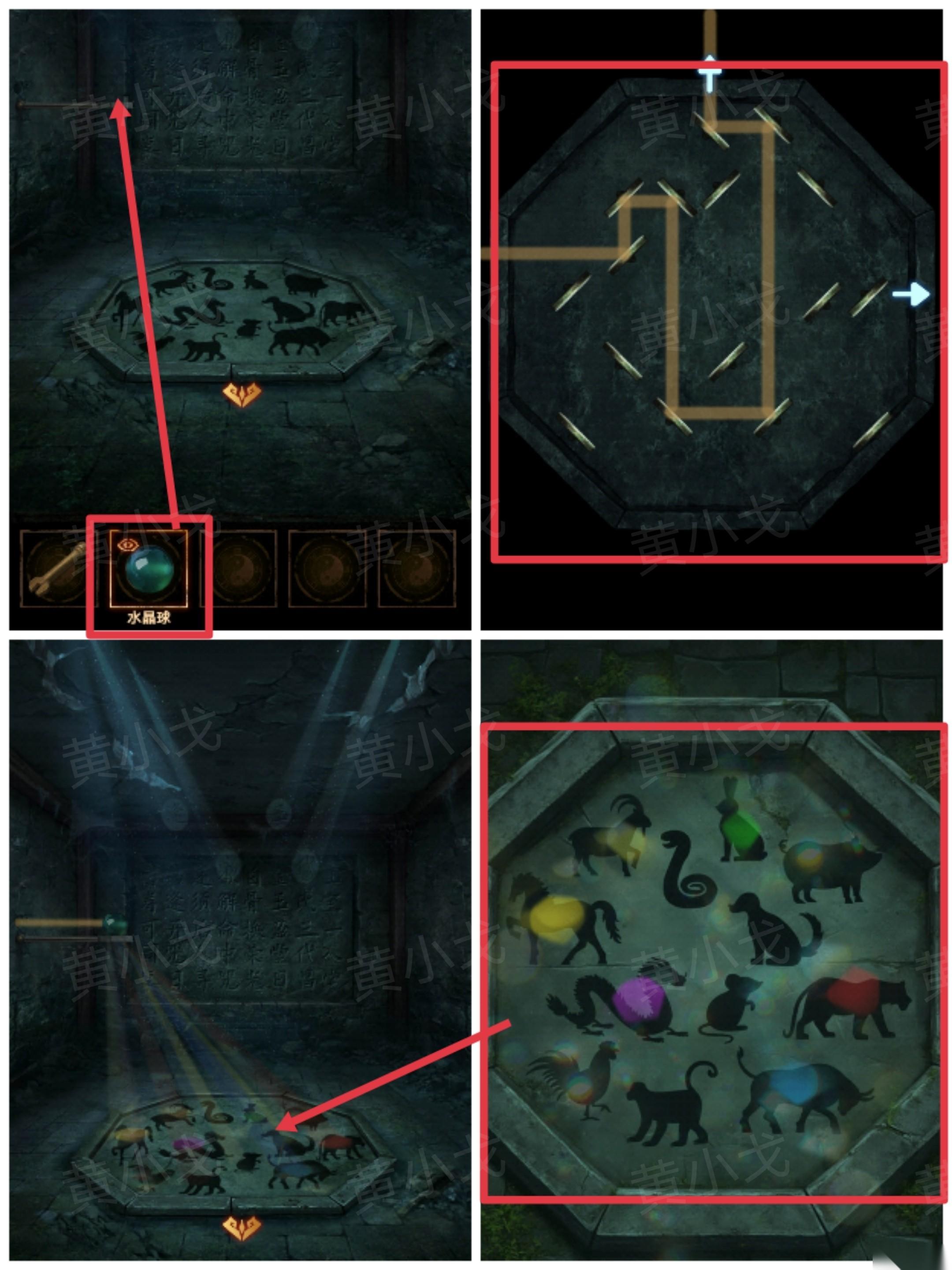 32、把【水晶球】放入墙上的圆形支撑架上;去到铜镜阵调整铜镜的角度,使光线射向墙上的孔洞中;查看地上的十二生肖板,获得线索