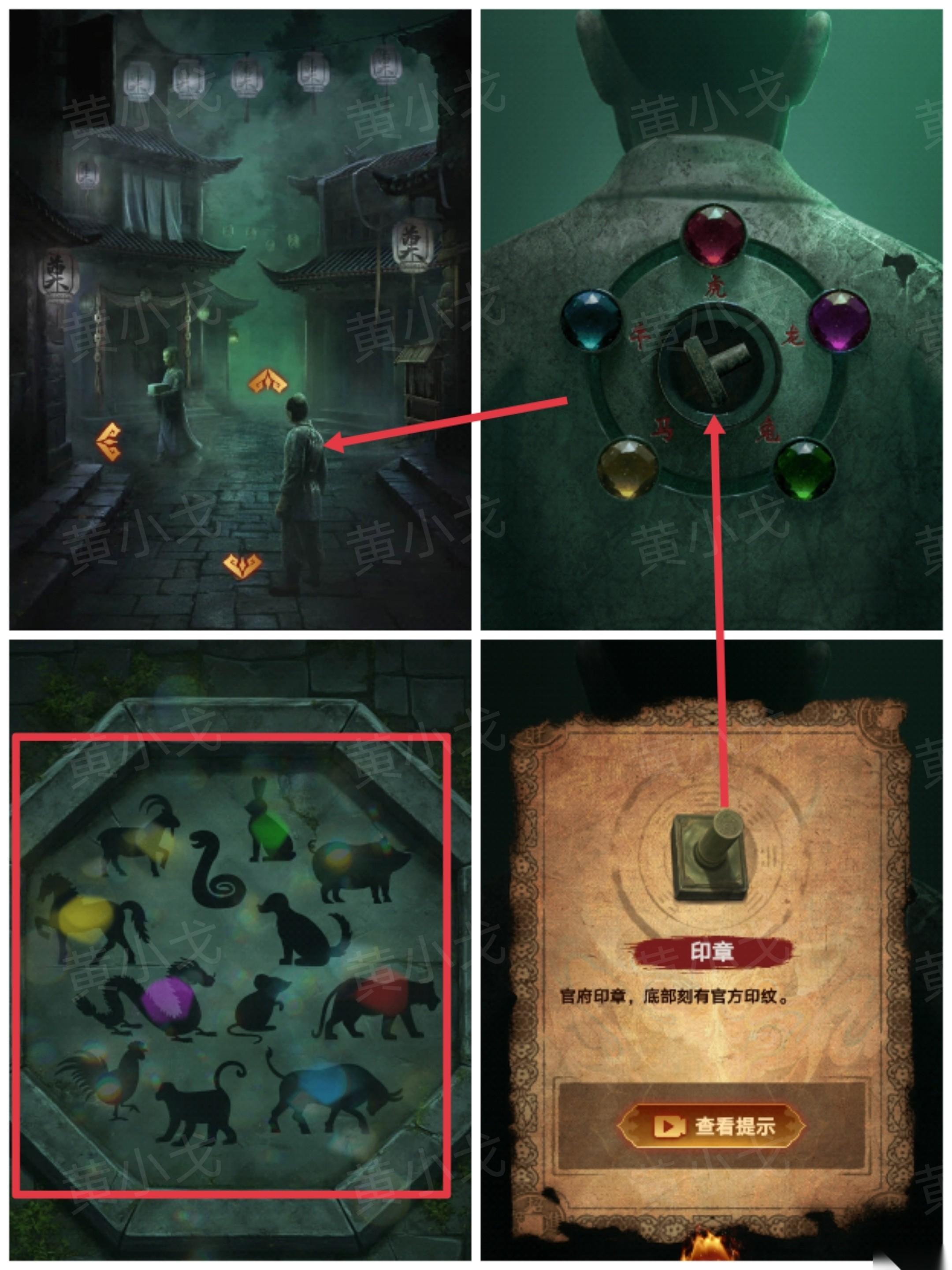 39、点击人偶背上的机关,根据[柳佳宁]视角十二生肖板上的线索,调整对应珠子的颜色;打开暗格,获得【印章】