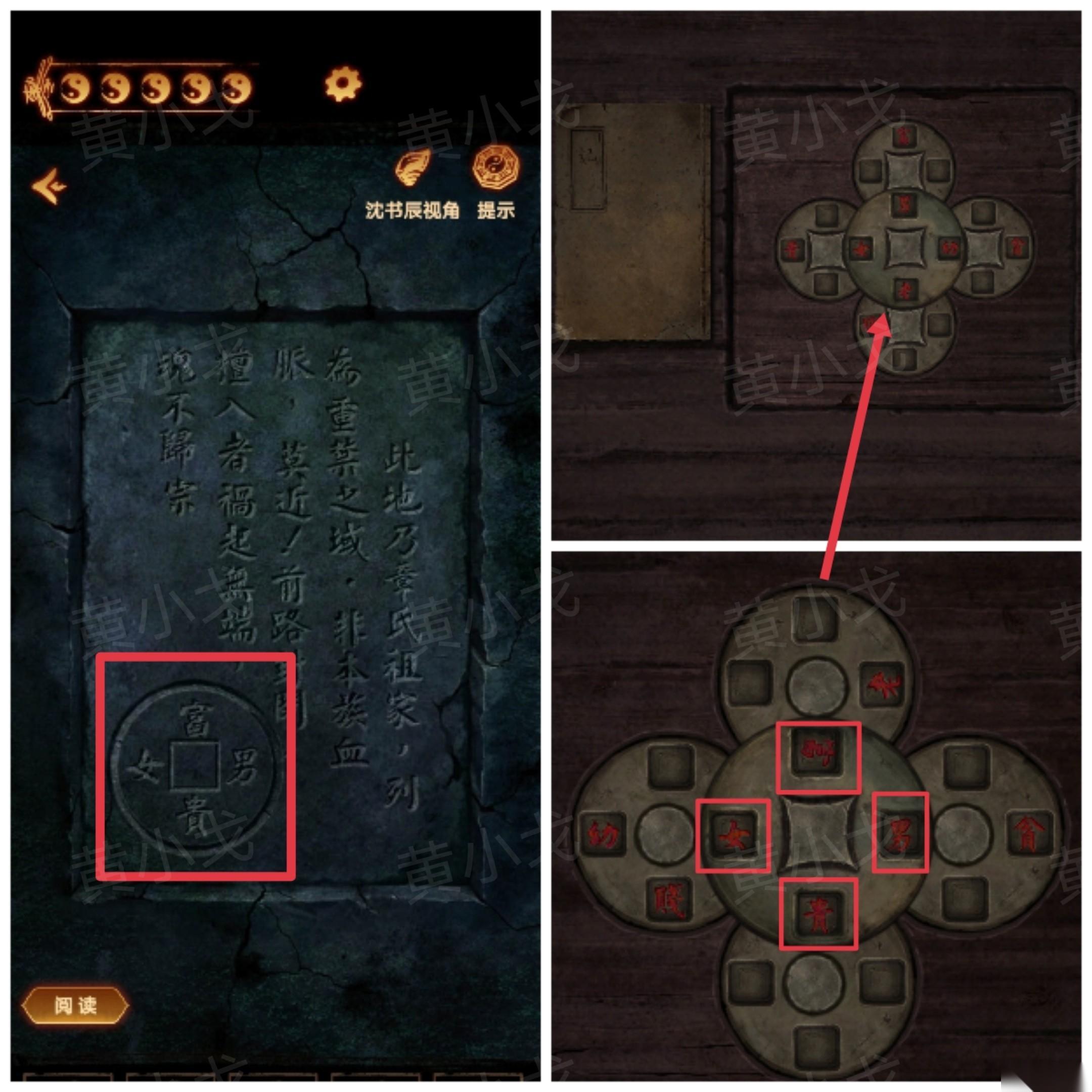 46、点击桌子暗格上的机关,根据[沈书辰]视角石门上的线索,调整机关