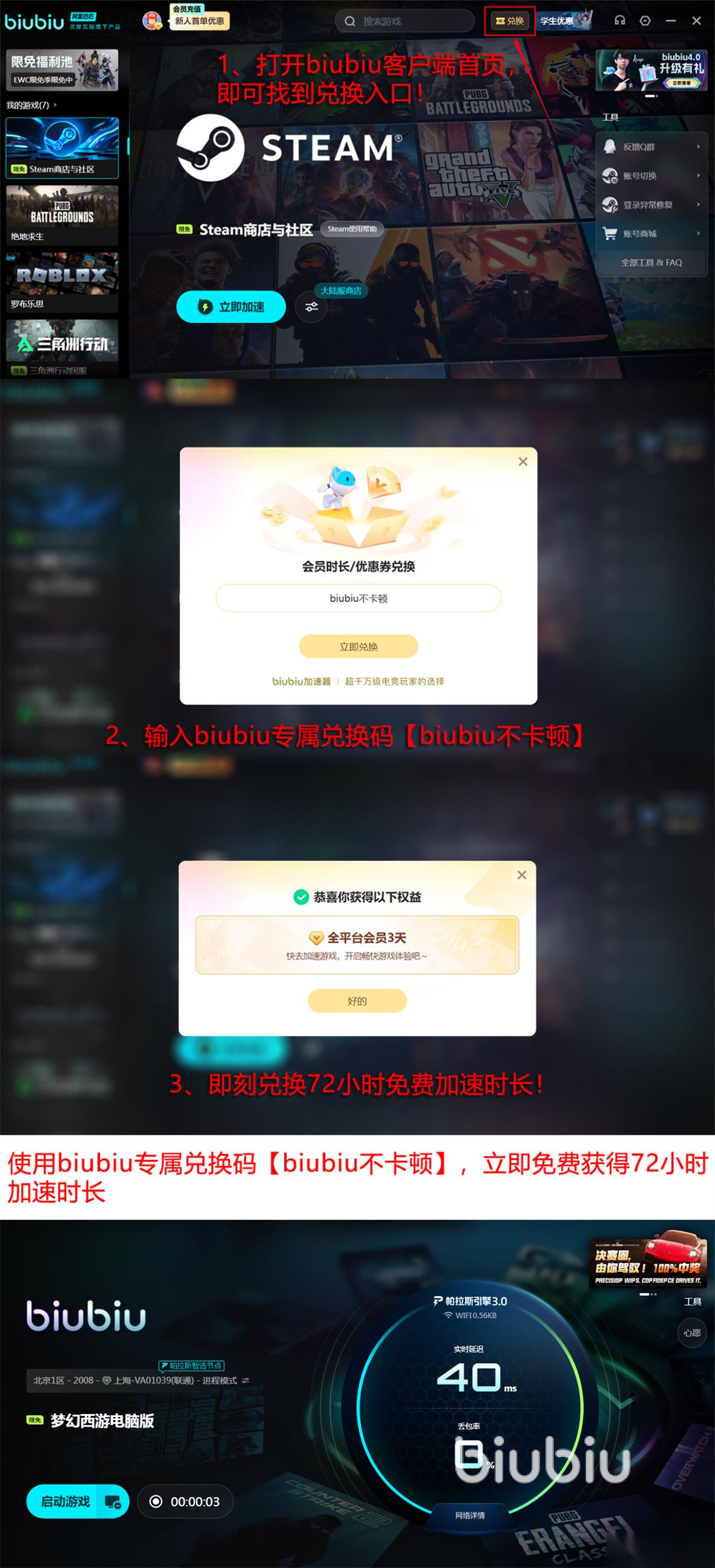 第一次使用biubiu的用户一定要记住,新号有24小时的免费加速时间,这些千万不要浪费。还有一个兑换码【biubiu不卡顿】,能兑换72小时的会员时间,兑换码每个号都可用一次。后续如果感觉biubiu确实起到了优化的效果,可以通过连续包月、直接购买整季度或是整年的方式成为长期会员,平均每天不到一元钱的价格,大家也能轻松承受。学生用户通过学生优惠活动还能享受多项福利。