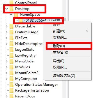 4、找到文件夹“Desktop”点击下拉再点击“NameSpace”右击下面的文件点击“删除”,如下图所示。