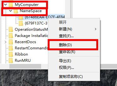 5、在找到文件夹“MyComputer”点击下拉再点击“NameSpace”右击下面的文件点击“删除”即可,如下图所示。