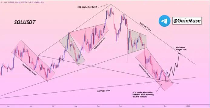 SOL价格在突破双底反弹后的下行通道后上涨,表明买家在经历了数周的下跌后重新掌控了市场。第一阶段的技术目标位在155-165美元附近,如果上涨势头持续,中期目标位则在175-180美元。