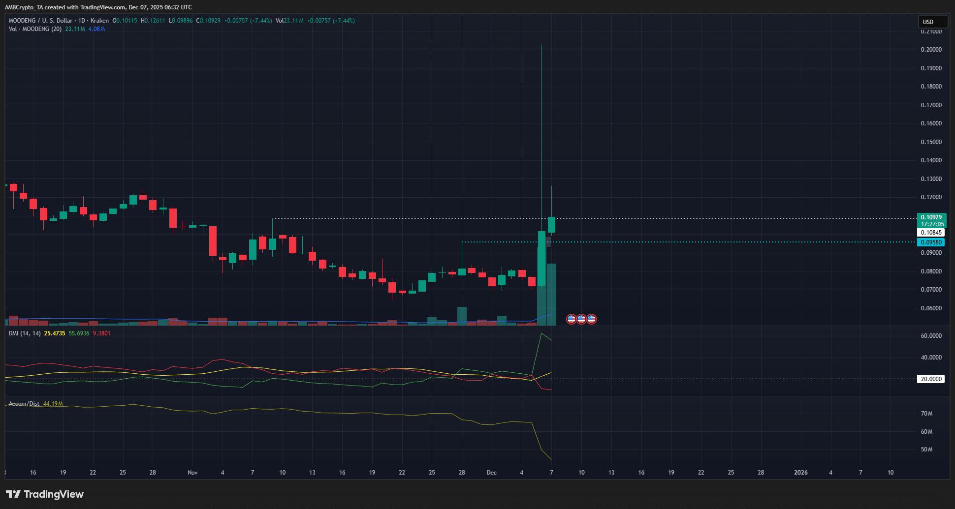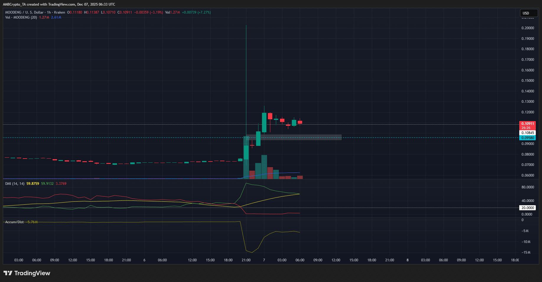 0.095 美元处的不平衡(白色方框)是一个有趣的需求区域。穆登的 [MOODENG]价格回落至该支撑区域后可能会再次反弹。反弹目标价位可能在 0.116 美元至 0.12 美元之间。流动性口袋头顶上方。