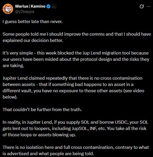 对他而言,这意味着“误导用户”和损害信任。因此,马里乌斯说Kamino 阻止了向 Jupiter Lend 迁移的工具,以降低风险。