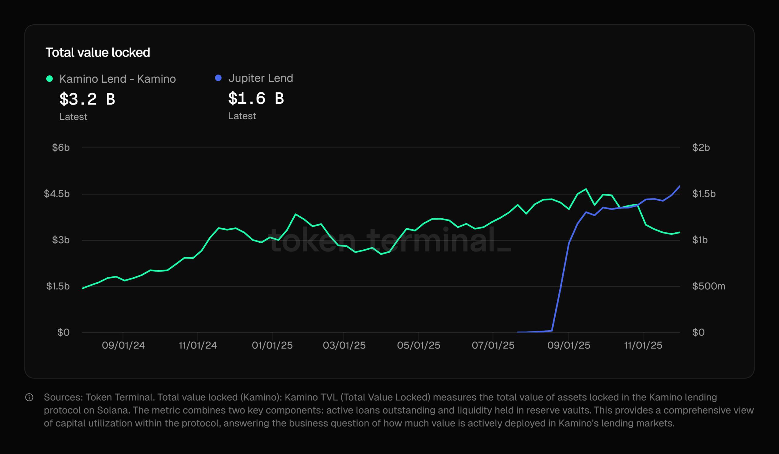 然而,就贷款业务而言,Kamino 的总锁定价值 (TVL) 超过 30 亿美元,是 Jupiter Lend 的两倍。不过,自 10 月份以来,Jupiter Lend 一直在蚕食 Kamino 的市场份额。令牌终端.