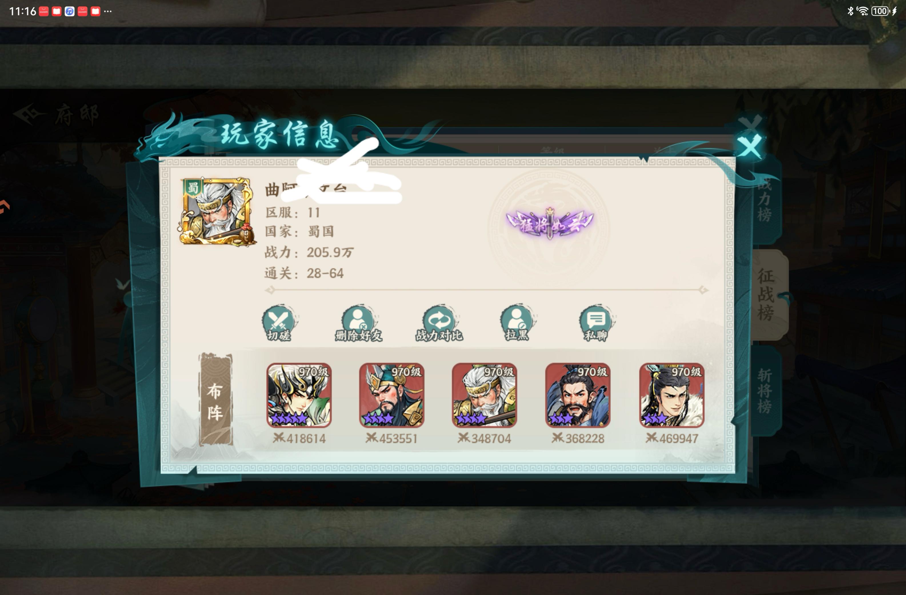 鄙人战力180万,征战打到29-2,在我们服排第四,排在第五的打到28-64,战力206万。