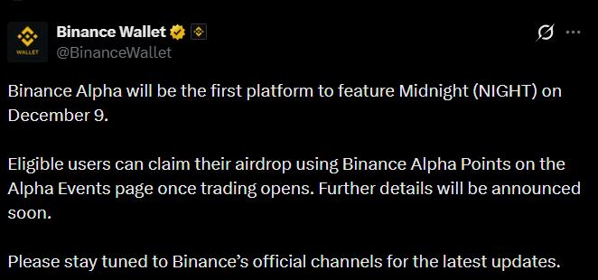 与此同时,币安将于明日在其 Alpha 测试区上线 Cardano 的 Midnight 代币 NIGHT。用户可通过 Alpha 积分解锁 NIGHT 的访问权限。币安将此次上线视为一次精心策划的“可控引爆”;此举旨在推广 Midnight 的品牌。“理性隐私””进入 Web3 地图的中心。