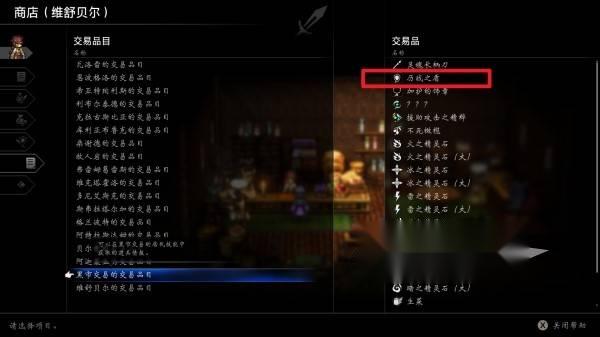 招募带有【黑市交易】能力的NPC移居维舒贝尔的商店(NPC具体位置请参考下文)。之后即有概率在维舒贝尔的商店刷出【历战之盾】,刷出之后交易品目也会解锁显示。