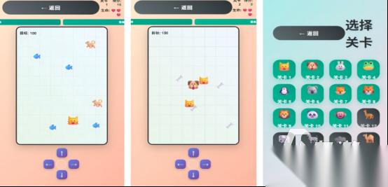 围绕着小动物闯关为主要核心,其中的小动物类型多样化,比如有大狮子或者是小狗狗等等,解锁不同的关卡主题之后,继续帮助其中的小动物收集各种食物,每个关卡开始之后都会呈现出色彩缤纷的美味食物,比如有骨头或者是有猫咪特别喜欢的鱼等等,屏幕下方有上下左右的滑动按钮,只需点击屏幕即可,收集更多食物,只要满足目标要求后,即可解锁更多难度关卡。