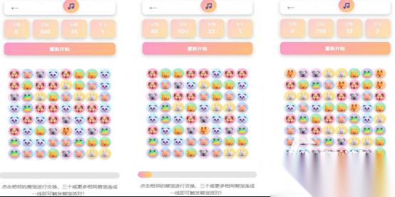 色彩缤纷的动物图案组合而成,要求特别简单,通过点击屏幕的方式,就能将相邻的两个可爱萌宠通过交换位置或者连线的方式,满足消除的要求,即可快速触发萌宠派对。融入经典三消玩法,每次消除的数量,最少都需要满足三个,一次性消除的数量越多,获得的分数也会越多。