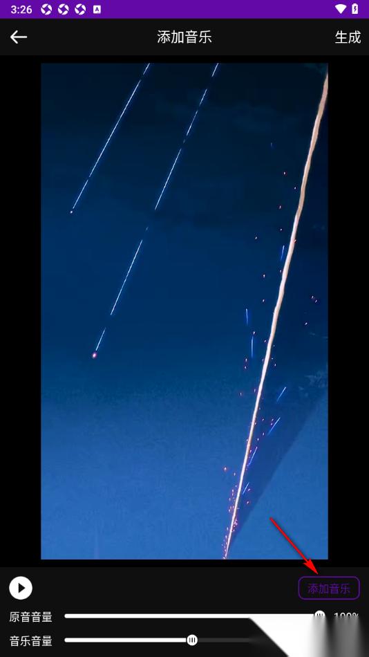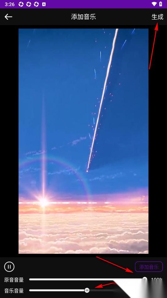5.加入音乐之后可以在底部调整原音音量和音乐音量,然后点击上方的【生成】按钮保存设置。
