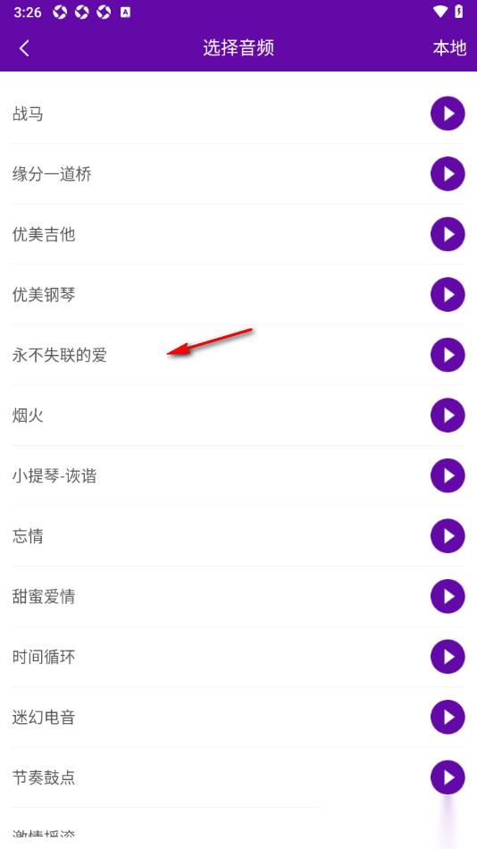 4.选择自己喜欢的一首音乐即可添加,或者可以点击右上角的【本地】功能可以从本地音乐中添加背景音乐。