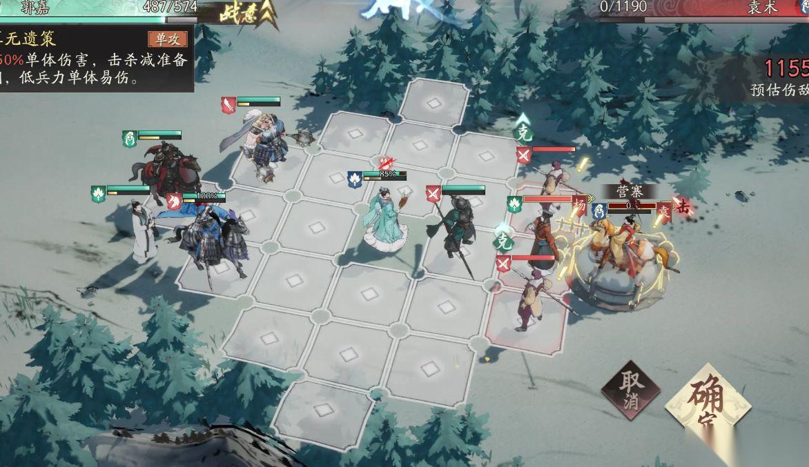 该章节的核心策略是,玩家需要率先使用骑兵占领敌方高地箭塔,随后使用自身的防御优势,直接绞灭敌方小兵,在小兵的阶段内,玩家需要尽可能的积攒战意和怒气,保证在第三回合袁术部队出现时,率领骑兵将其引至箭塔附近,随后所有角色释放怒气技能,展开一次剿灭。