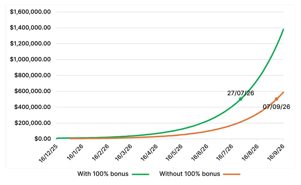 如您所见,如果您现在投资 5000 美元参与预售,到 7 月底您将获得 50 万美元;而如果您等到 1 月份再购买,您的投资则要等到 9 月份才能到账,并且价值将远低于第一种情况。