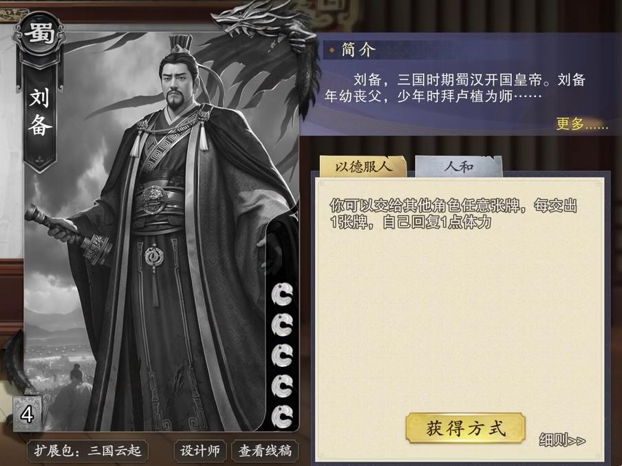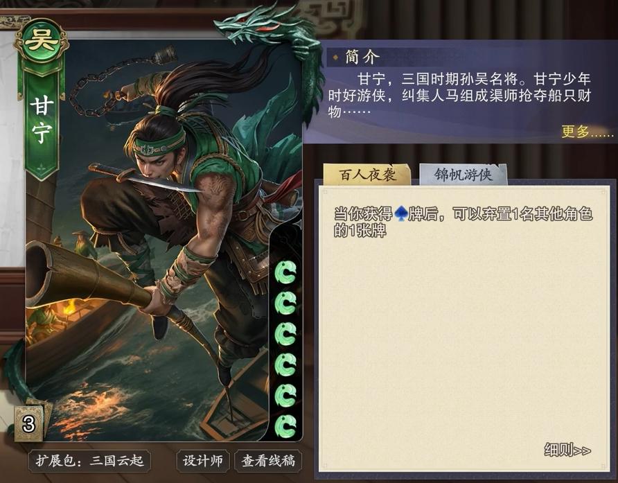 刘备与甘宁也是很适配的拆迁组合搭配,毕竟甘宁只要获得黑桃手牌就能拆掉对手的牌,而且这一条件没有太多的限制,不管是甘宁自己摸到黑桃,还是别人给他黑桃,都能激活他拆牌的能力。碰巧,刘备又是一个具备着能稳定给别人牌的武将,只要在自己回合内就能选择手牌给他人,所以能让甘宁的技能频繁地进行发动。若是一回合内出现刘备给甘宁黑桃牌,甘宁自己摸上黑桃牌,且弃置手牌摸牌后又拿到了黑桃牌,就能实现一回合三连拆,让敌人很是难受。