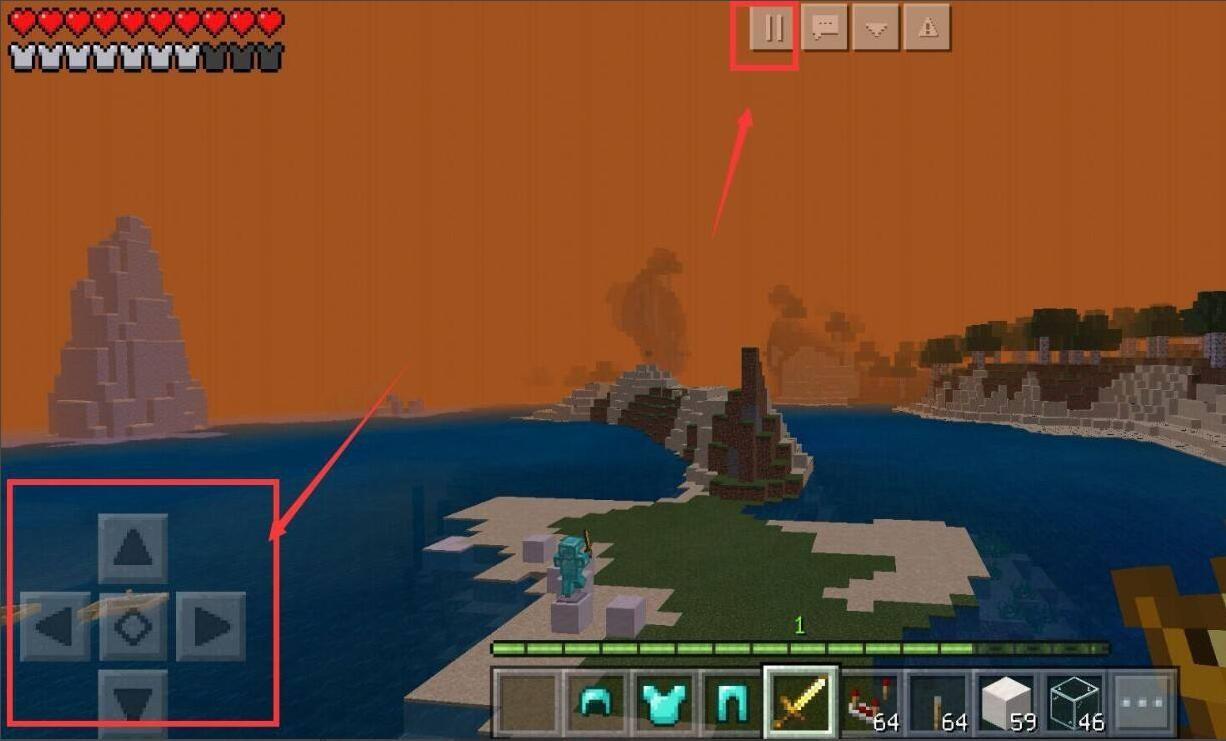 启动我的世界,进入局内游戏,此时方向键是十字形状的,点击上方的【暂停】按钮。