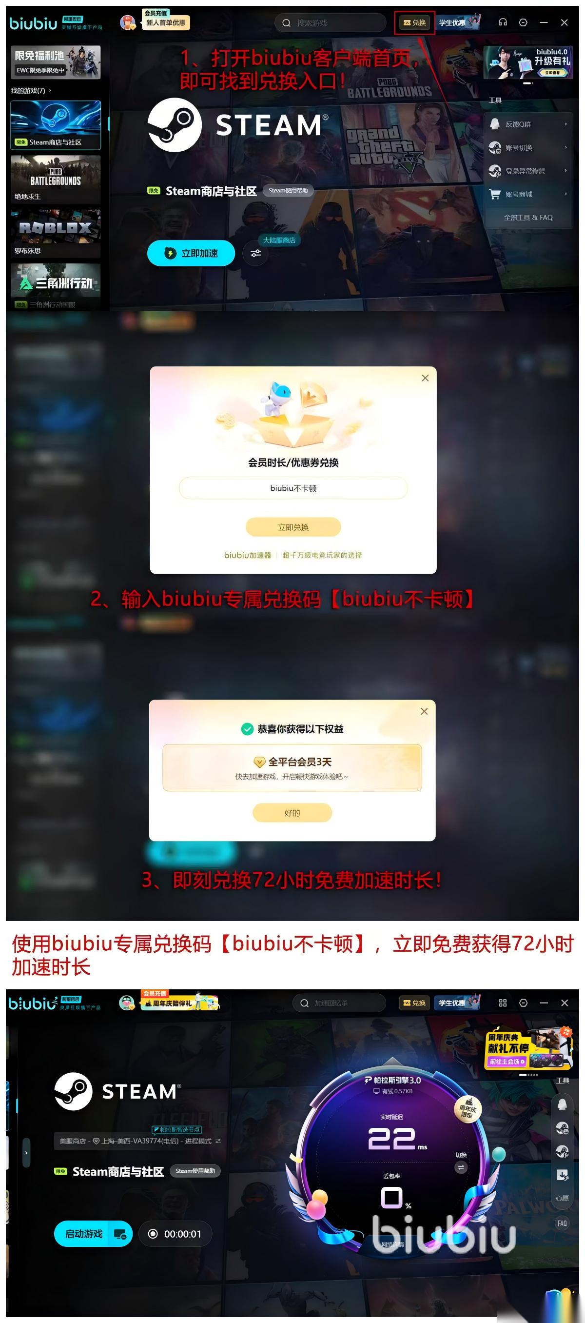 有很多玩家不清楚游戏加速的实力,这也就导致不太想尝试biubiu加速器,这个时候推荐各位使用【biubiu不卡顿】领取72小时的加速时间,如果说还是新用户也能获取24小时的时间,总计96小时,这写时间对于一款付费的加速器来说已经是非常长的体验活动了,总体上多有的玩家都能稍微提升自己的加速能力了,等待后续想要的时候再次升级一下。