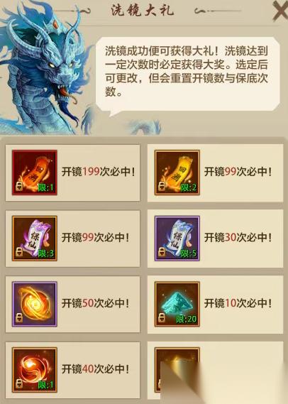 活动期间,如果洗镜成功将使尘镜焕新,镜仙将会把洗镜大礼赠予你,洗镜失败也将获得失败奖励。选择不同的大礼,必定获取大礼所需次数也不同。