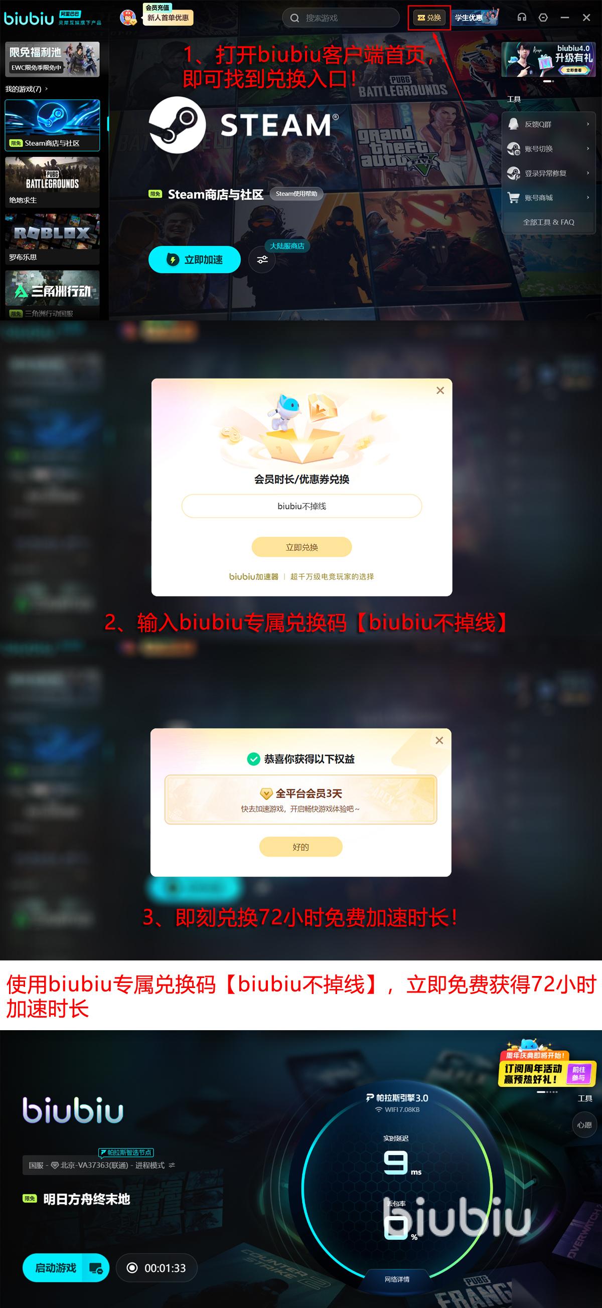 新玩家还有专属福利,最高可享96小时免费加速:只需使用【biubiu不掉线】就可领取3天时长,并在注册登录后再获赠24小时,即可叠加生效。