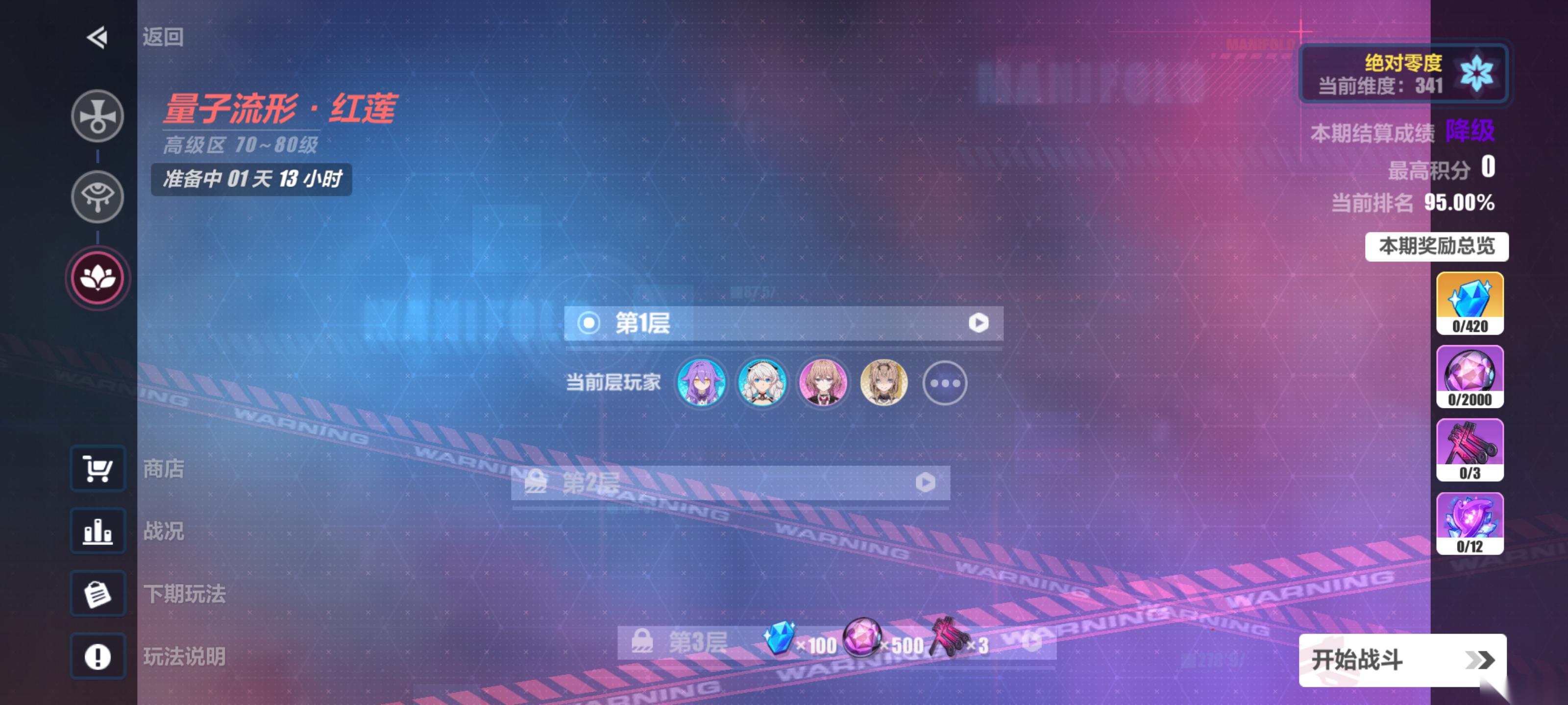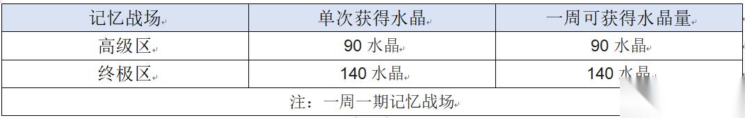 ❷记忆战场:高级区90水晶/周,终极区140水晶/周。高级区只有通关次数奖励,终级区多了sss奖励40水晶,每周一次。