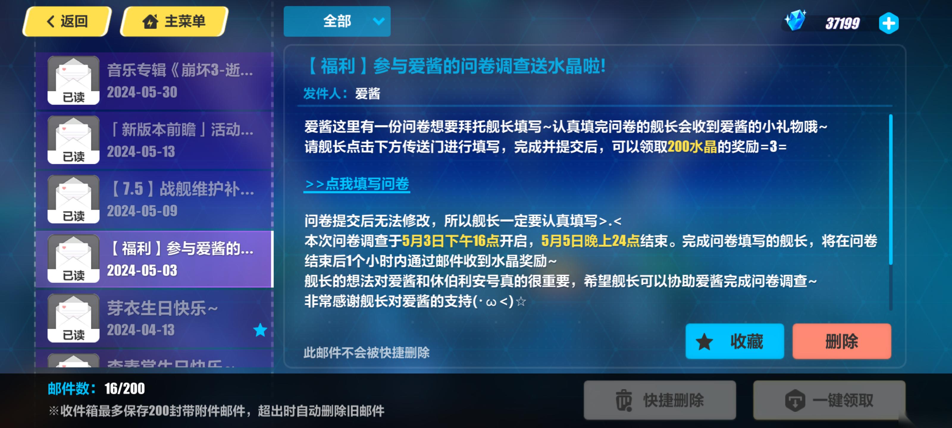 每个版本都会出一次调查问卷,面向全体舰长针对新版本的意见,填完可以获得200水晶。