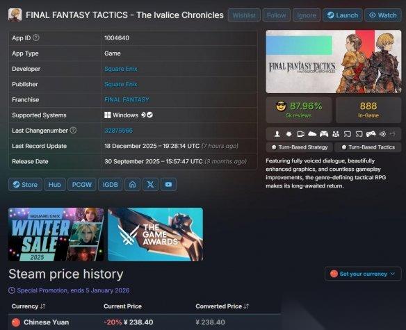 史克威尔艾尼克斯Square Enix今日正式宣布,旗下口碑炸裂的策略RPG重制版《最终幻想战略版:伊瓦利斯编年史》在Steam平台开启发售以来的首次折扣活动。标准版目前享受20%的优惠,国区价格已达新低。考虑到该作刚刚在TGA 2025上力压群雄拿到最佳模拟/策略游戏,这波趁热打铁的促销操作属实是让等等党赢麻了。