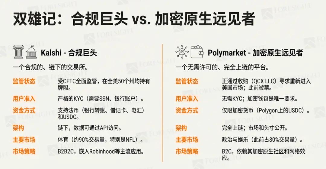 要理解预测市场格局,首先必须认识到其两大领导者 Kalshi 和 Polymarket 之间的根本差异。它们的对立理念不仅仅是运营细节,更代表了对于这一资产类别未来的两种不同愿景。Kalshi 体现了一种合规的、自上而下的模式,专为融入主流市场而设计;而 Polymarket 则倡导一种无需许可的、自下而上的模式,植根于加密原生原则。这种战略分歧定义了当前的竞争动态,并将塑造行业的发展。