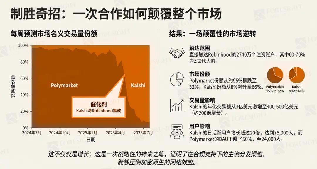 效果立竿见影且意义深远,引发了市场领导地位的彻底逆转,并验证了 Kalshi 合规化、B2B2C 战略的有效性。