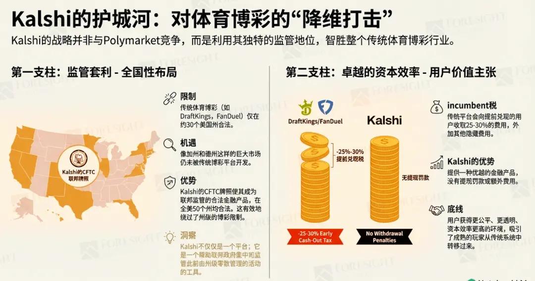 理解 Kalshi 战略的最佳方式,是将其视为对传统体育博彩行业的一场“降维打击”。它并非在加密原生层面与 Polymarket 竞争,而是利用其独特的监管地位来智胜并颠覆 DraftKings 和 FanDuel 等传统巨头。这场攻击建立在两大支柱之上。