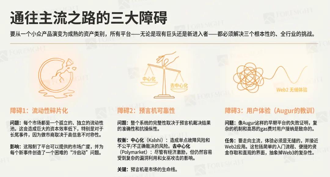 尽管各自取得了成功并拥有清晰的战略路径,但 Kalshi 和 Polymarket 都必须克服三个根本性的、行业性的挑战,才能将预测市场从利基产品演变成一个成熟且被广泛采用的资产类别。这些障碍涉及市场结构、系统完整性和用户可访问性。