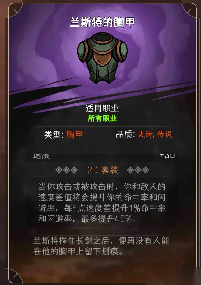 鞋子速度取50(我最快的鞋子也才53不知道最快多少),塞西莉亚基础速度60,加上兰斯特的50总计160,根据游戏内图鉴信息怪物速度40-85居多(部分100、300、20的算少数,主要计算通常情况下的增益)取个中间值62,160-62=98 兰斯特套装每5点速度差提高1%命中和闪避,也就是20%的命中和闪避