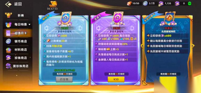 3. 月卡选择:优先买特权卡扫荡不限次数,解决体力浪费问题,平民必备后面可考虑资源卡,解锁更多交易相关特权,商城两张月卡同步拿下,体力上限从30提升至50,副本挑战次数增加。
