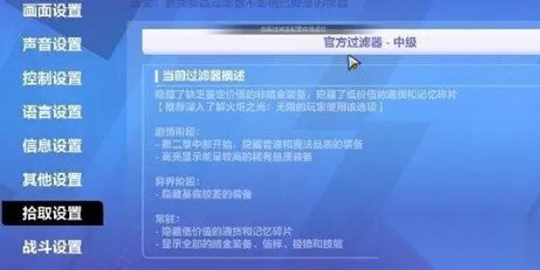 - 拾取页右面往下拉,改物品过滤等级,比如初级、中级、高级。